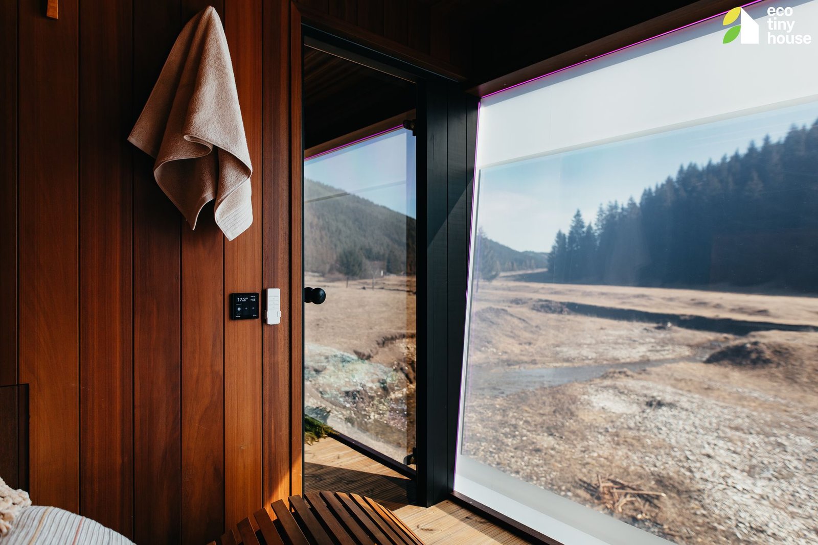 Hlavní prostor pro spaní je obklopen panoramatickými okny, která vám poskytnou úchvatný výhled do okolí a umožní Vám probouzet se s pocitem propojení s přírodou. Tento jedinečný prvek dodá vašemu bydlení nádech luxusu a originality.