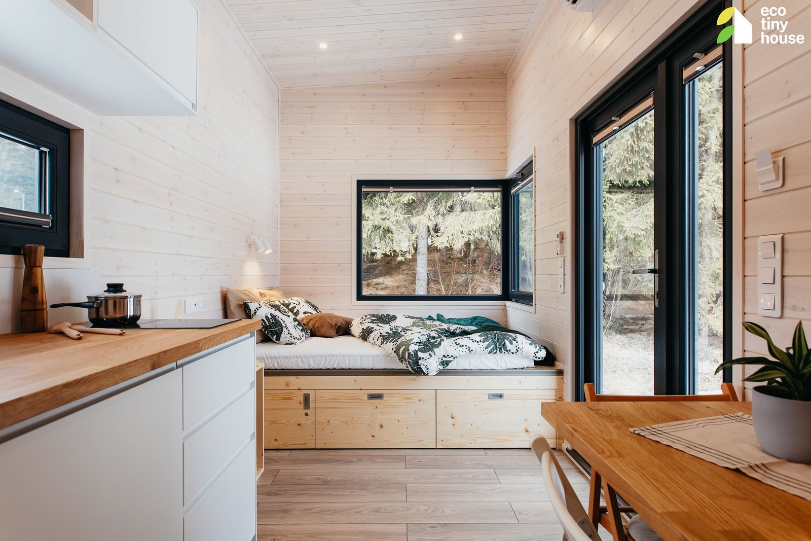 Domek Rubik je doslova prosvětlen sluncem. Více než 6 metrů čtverečních oken zajistí, že Váš obytný prostor bude vždy plný přirozeného světla. Užijte si teplé sluneční paprsky a vytvořte si příjemnou a energickou atmosféru.